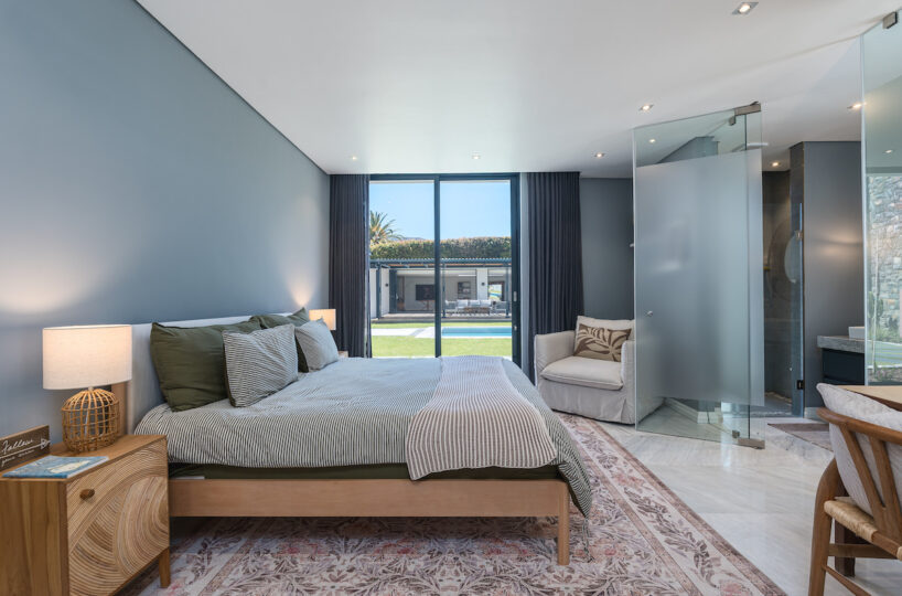 Upstairs you’ll find four of the six bedrooms, including a master suite with a walk-in dressing room, en suite bathroom, and private balcony with garden and mountain views. Three further bedrooms each offer queen-sized beds, Smart TVs, and their own en suite bathrooms, ensuring comfort and privacy for all.
