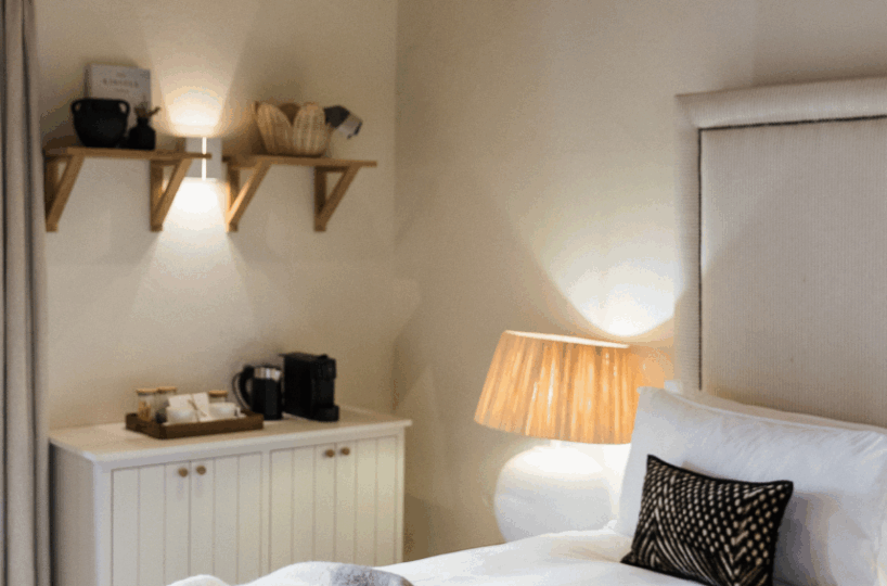 - Citrus Room (38 m2): Twin beds (extra length), en-suite with shower, private veranda with orchard/courtyard views (beds can be combined into a Super King).